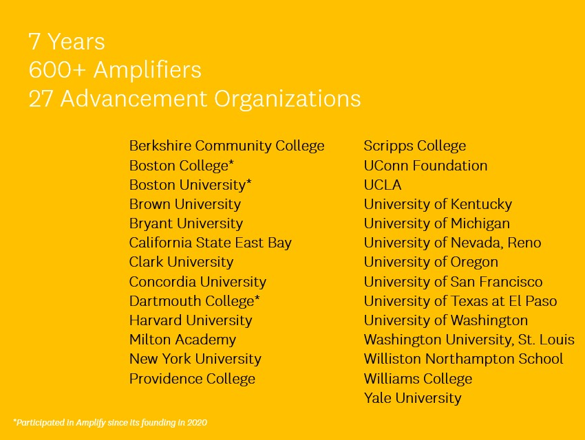 Amplify launched in 2020 as a collaborative effort between CASE D1, Dartmouth College, and Boston University. Seed money from the CASE D1 Venture Fund supported Amplify in its first year until the program became self-sustaining through program fees.